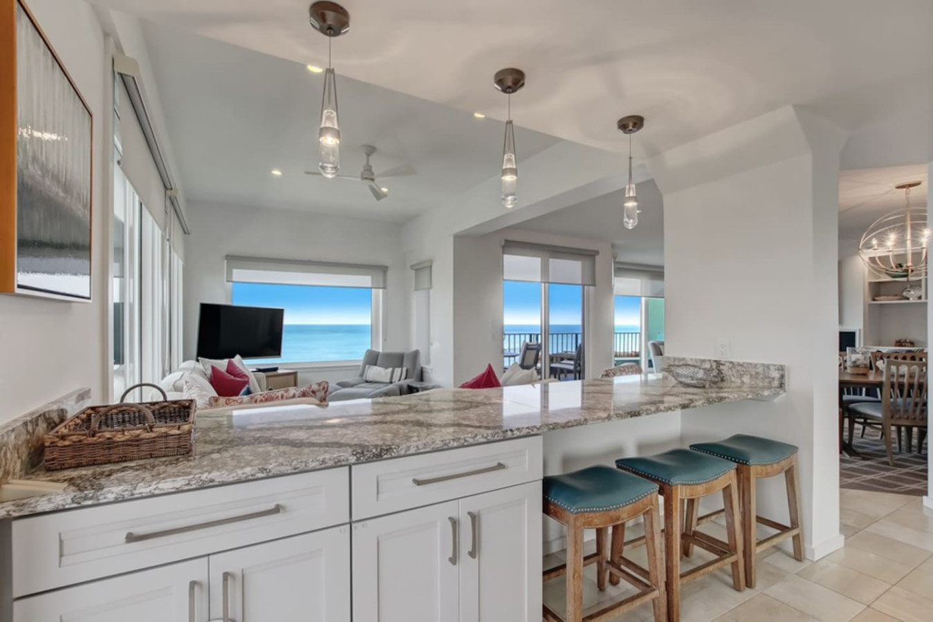 We spent six weeks in this beautiful condo enjoying the views, it definitely was our home away from home. The appliances were up to-date, the kitchen was well supplied with dishes and cutlery, you could watch the large screen T.V. in the family room and still see the beach, the front patio had lots of comfortable furniture to watch the surf rise and fall, absolutely perfect.